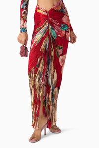 Featuring Maroon Prime Gigi Skirt by Saaksha & Kinni's Nirah Collection. This striking maxi skirt showcases a floral print, hand micro-pleated texture, and an asymmetric silhouette, elevated with intricate zipper detailing for a bold and contemporary edge.