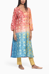 Bring on the shine of sequin details and the magic of bright hues to your festive wardrobe with this gorgeous Maroon Teal Geometric Flower Shibori Kurta. The tunic is a V-neckline with front gatherings, embellished with antic gold sequins.ÂÂ