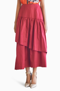 Featuring maroon asymmetrical tier mid length skirt and also has pockets.