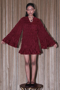 Embrace bohemian elegance with this Maroon Velvet Kedia Dress. Featuring an exaggerated Kedia-style top with ties at the bust, it has a smocked, boxy body and dramatic bell sleeves for a statement look. Perfect for effortless style with a touch of tradition.