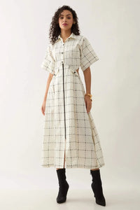Featuring the Regal Print, the Martin Offwhite Dress combines a classic collar and wide short sleeves for a structured yet breezy look. Front buttons and a black zipper run down the front, while a side waist cut-out and vertical topstitching add modern touches to this elegant, tailored design.