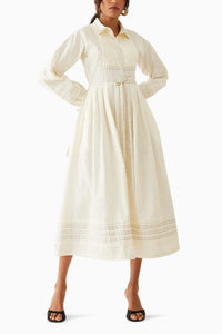 The Masa Dress is a refined shirt-style silhouette, featuring a crisp shirt collar, concealed placket, and full-length sleeves. A standout pleated yoke bib is framed with delicate Lanes piping, adding depth and subtle contrast. Thoughtfully placed Lanes print accents at the sleeve and dress hems add visual interest, while the full pleated skirt brings graceful movement and structure. Elegant and detailed, the Masa Dress transitions seamlessly from day to occasion wear.