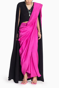 Composition- Silk and Japanese Crepe Color- Fuschia & Black Fit- This sari fits true to size, takes the shape of your body as it is a drape. The sari is high waisted, get it according to your high waist size. The top has a relaxed fit. Components- 2 Product code - SVE431882191603&1220302