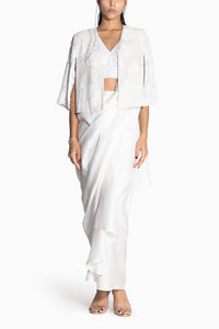 Our Masai Godet Sari is pre draped and fuss free . With a built in petticoat, the pallu gets attached to the waist with the clever use of a snap button and stays on while you are on the move. Go all white with our embroidered blouse and our favourite Wave Cape which is very versatile.