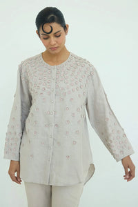 Step into timeless elegance with the Masie Circles shirt—crafted with care and a touch of charm. It elevates your vibe from day to night with effortless sophistication.