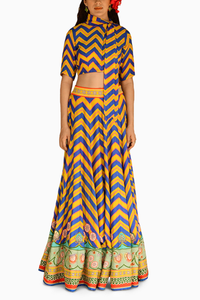 Mandawa is an expression of emotions that bridges the journey of prints and patterns that we hold in our cultural roots. It is a melange of traditional butas, beads, and borders. A wedding wardrobe essential, this Mastani Lehenga set features a flowy lehenga paired with a matching crop top.