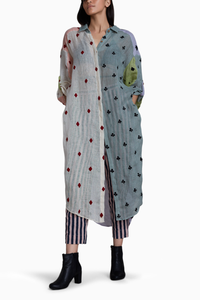 This colour block embroidered pure linen shirt is a perfect definition of style and ease. The v neck buttoned down detailing and the play of color is perfect for an edgy festive look. This set comes with well fitted striped pants which are elasticated at the back.