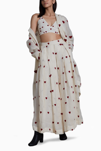 An interesting and modern take on the traditional lehenga set. The bralette, lehenga and scallop stole are made in pure linen with intricate all-over thread embroidery. You can even style it with a cover jacket from our collection for a complete festive look.