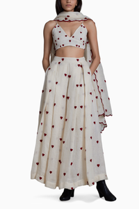An interesting and modern take on the traditional lehenga set. The bralette and lehenga are made in pure linen with intricate all-over thread embroidery. The set comes with a cover jacket from our collection for a complete festive look.