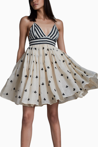 Introducing a new fun Rummy dress! The dress is cut in handloom cotton with hand block print and rich handwoven linen with motifs embroidered all over. Wear It with our matching crop jacket and complete the look.