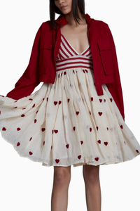 Festive season calls for a mix of soothing embroideries and playful silhouette. The dress is cut in handloom cotton and rich linen with the tie up at the back and a mix of stripes and embroidery makes it a wardrobe must have. Style this versatile set together or separately.