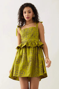 Featuring the Anther Print, the Maud Leaf-Colored Dress showcases a chic square neckline and delicate straps for a refined yet playful look. Pleats and gathers add depth, while a back button and zipper ensure a seamless fit. Perfect for day or night, it pairs effortlessly with sandals or heels.