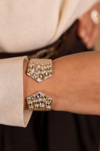 Max Cuff by UNCUT is a striking statement piece crafted in an elegant silver–gold dual tone. Designed with bold contours and highlighted by natural Polkis, it blends contemporary edge with timeless charm, making it the perfect accent for elevated, modern styling.