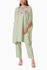 This mint green kaftan-style kurta showcases a stunning appliqué floral panel on the front, adding a sophisticated touch. The 3/4th sleeves are adorned with matching appliqué embroidery, enhancing the overall design. Paired with straight pants that are finished with delicate pleats and piping at the hem, this ensemble combines comfort and style effortlessly.