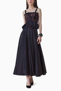 Featuring Maya Smocked Peplum Blouse & Ria High-Waist Flared Skirt by Saaksha & Kinni, this elegant set includes a smocked peplum-style sleeveless blouse with intricate mirror and thread hand-embroidered detailing. Paired with a high-waist flared skirt, featuring a center button closure for a chic, timeless look.