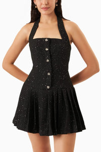 Featuring Mayfair Dress by Anahe, this elegant black tweed dress features a tie-around neck and delicate pleats. Its fit-and-flare silhouette effortlessly combines classic charm with modern sophistication for a timeless, polished look.