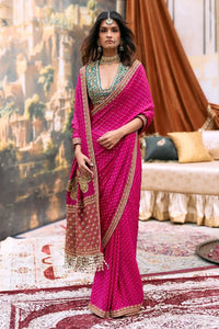 Composition: Bodice- Raw Silk, Cotton Cambric, Saree- Crepe, Chanderi Brocade Color: Pink, Turquoise Components: 2 Product Code: SVEITRHBR59