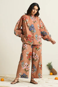 This Meadow Co-ord Set features a relaxed fit shirt and straight pants, both adorned with a hand rendered floral print. The delicate fagoting detail sit beautifully on the shirt yoke. The pants come with an