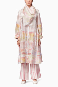 Introducing the Meadow Kurta and Trousers Co-ord Set with Scarf, a vision of sophistication in Chanderi silk. Adorned with a charming strawberry field print, it boasts a unique lace design and side gathered style on the kurta. Paired with cotton-lined trousers and a matching scarf, it's elegance redefined.