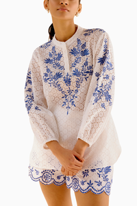 Featuring a cotton eyelet shorts set and top with blue floral embroidery.