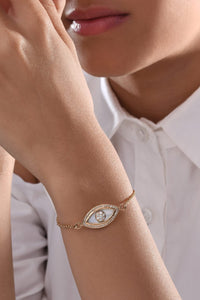 Evil Eye diamond with Mother of Pearl inlay bracelet in 14KT Yellow Gold are featured from our Everyday Luxury Collection, which is easy to wear and can take you from day to night. Stone : Full Cut Diamonds and Large Marquise Mother of Pearl (30 mm)