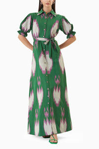 Introducing the Medusa dress, a timeless piece crafted from Uzbek handloom silk Ikat. It features belted shirt-dress silhouette, elastic short sleeves cuff, and mother of pearl buttons.