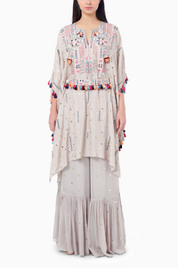 Featuring Grey colour dot mukaish silk yoke embroidered short kaftan and colourful tassels with belt and mukaish georgette frill palazzo.