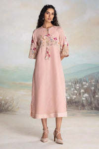 A round-neck dress adorned with exquisite handmade tassels and flared raglan sleeves, offering a blend of elegance and movement. The dress is embroidered with ombré-dyed cotton thread, creating an embossed texture that evokes the essence of a beautiful meadow, adding depth and a soft, natural touch to the design.