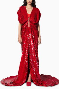 The Mega Cape is a hand crafted statement cape that is size-ombre'd from the shoulder to the hem. Wear it with a sari or a simple bustier and pants for a statement look.