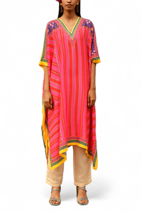 Mandawa is an expression of emotions that bridges the journey of prints and patterns that we hold in our cultural roots. It is a melange of traditional butas, beads, and borders. A perfect blend of comfortable silhouettes with traditionally handcrafted motifs, this Kaftan is an amalgamation of happy hues! A classic evergreen straight pants with an elasticated waist and side pockets.