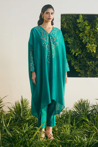 Featuring Mehar Co-ord Set by Shikha Mehta from Baagh Collection. This emerald silk chanderi kaftan tunic, adorned with multicolor thread embroidery, pairs beautifully with matching emerald cigarette pants and a short cotton slip. The ensemble blends luxurious fabric with intricate detailing for a refined, elegant look.