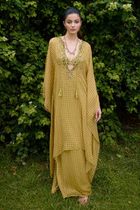 Featuring the Mehbooba Olive Kurta Set by Nikasha’s Dilruba Collection, this olive georgette kaftan showcases Chotu Sanga prints with subtle embroidery. It is paired with a heavily embroidered bralette and a straight skirt with side slits, offering a bold yet elegant silhouette.