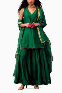 This rich green kurta, crafted from Chanderi fabric, features intricate bijiya gota detailing and a bright pink peek-a-boo contrast at the hemline. It includes a practical side zipper opening and is paired with Chanderi sharara pants, also with a side zipper and button fastening. The ensemble is completed with an embroidered Kota Doriya dupatta in silk, adorned with bijiya gota along the hem. The kurta and sharara are fully lined, and the kurta’s V neckline adds a touch of elegance to this sophisticated outfit.