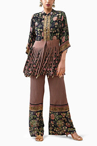 The Black Mehr Embroidered Kurta Top in Crepe showcases intricate embroidery that adds depth and sophistication to the sleek, modern silhouette. Paired with matching crepe pants, this ensemble creates a balanced, elegant look, making it perfect for formal or festive occasions. The combination of timeless black with delicate detailing exudes effortless style.
