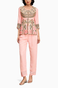 The Pink Mehr Embroidered Peplum Top in Chanderi features exquisite embroidery and panel detailing, creating a graceful and flattering silhouette. It is paired with multicolored printed pants in crepe, offering a vibrant, chic contrast that enhances the overall elegant and contemporary appeal of the ensemble.