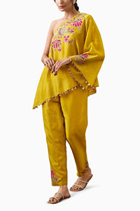 The Yellow Mehr Applique One-Shoulder Top features intricate floral applique work, adding a touch of elegance and uniqueness to the design. Paired with a matching inner and yellow linen pants, this ensemble offers both comfort and style. Perfect for casual or semi-formal occasions, it blends modern flair with traditional craftsmanship for a fresh, vibrant look.