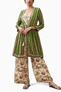 The Beige and Green Mehr Printed Jumpsuit offers a stylish and contemporary silhouette, complemented by a beautifully embroidered peplum jacket with a cape design. This ensemble effortlessly combines modern chic with intricate detailing, making it perfect for evening events or formal occasions. The luxurious fabric and unique styling create a refined and elegant look.