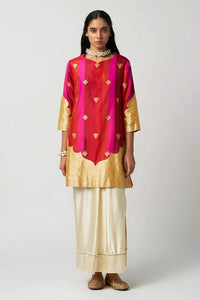This vibrant Pachranga kurta, crafted in pure handwoven silk and detailed with our signature bee motif. The kurta features a distinctive KimKhwaab cut shaped like a Mughal arch, blending timeless heritage with a playful, contemporary edge.