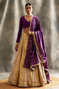 Featuring a rich purple linen blouse paired with a silver-gold paneled lampi lehenga, complemented by a linen dupatta adorned with customized khadi block prints and intricate zardosi dabka embroidery — a refined blend of artisanal detail and regal elegance.