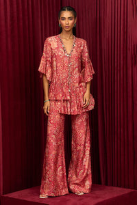 Featuring the Melody Frill Top Pants Set from Ridhi Mehra's Jazz-A-Jashn Collection. This stunning ensemble features a red printed fine silk embroidered ruffled top paired with printed cotton satin flared pants. Perfect for a chic and vibrant look, it exudes elegance and style!