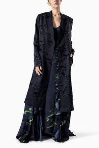 A thousand melting crescents painted with beads on the finest silk. The statement jacket is intricately hand embellished, hand sewn and lined in fuchsia dusk fluid silk. It comes in a sharp single breasted fit, notch collars, and side welt pockets.