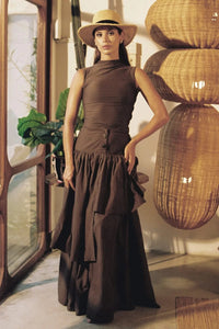 Inspired by the fluid elegance of marine life, this high-waisted silhouette features a V-cut front, inspired by the delicate curves of fish fins, while smocking at the back ensures a perfect fit. Flowing dramatically to the floor in an asymmetric cascade, the skirt mimics the graceful movement of a fish gliding through water.
