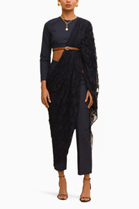 This chic solid crop top features full-length sleeves, a round neckline, and sleek leather belt details. Paired with tailored ankle-length pants, it offers a zip closure, fused waistband, and a flattering silhouette. The addition of a mesh drape adds a stylish touch, making this ensemble perfect for both elegance and comfort.