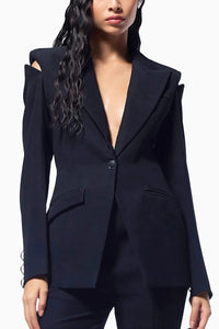 This classic black tailored jacket combines sophisticated design with edgy details, featuring metal septums delicately placed along the spine and shoulder peek cutouts that add a striking allure. The tailored fit with a peak lapel and single button closure ensures a sleek, refined look.