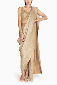 Composition- Pleated Metallic and Silk Colour- Chocolate Gold Fit- This sari fits true to size, takes the shape of your body as it is a drape. The sari is high waisted, get it according to your high waist size. The cape is freesize Components- 2 Product code - SVE431881201603&1200208