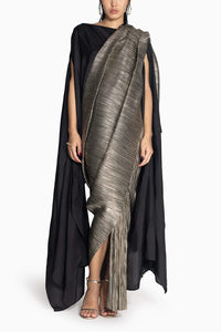 Composition- Pleated Metallic and Silk Colour- Black Gold Fit- This sari fits true to size, takes the shape of your body as it is a drape. The sari is high waisted, get it according to your high waist size. The cape is free size. Components- 2 Product code - SVE431881201603&1200302