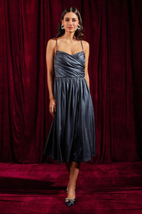Our metallic midi dress features delicated drapes along the torso, a cinched waist and thin shoulder straps. Pair it with embellished flats or stilettos – the choice is yours.