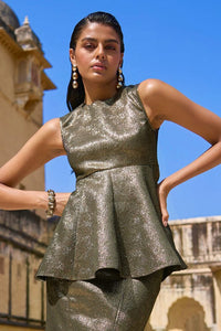 Peplum shaped self brocade corset inspired sleeveless top in a textured metallic fabric. Zip in the back neck.