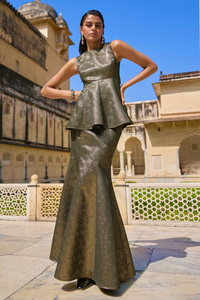 Peplum shaped self brocade corset inspired sleeveless top in a textured metallic fabric. Zip in the back neck. Paired with a matching mermaid shaped maxi skirt. Zip in the side.