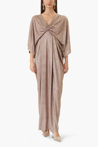 Champagne draped kaftan dress in pleated foil print fabric. Twisted knot detail at the center front, softly draped and cowled below the waist to add movement and shape. V-neck, kaftan-style sleeves. Zip closure at the back. Garment is fully lined.